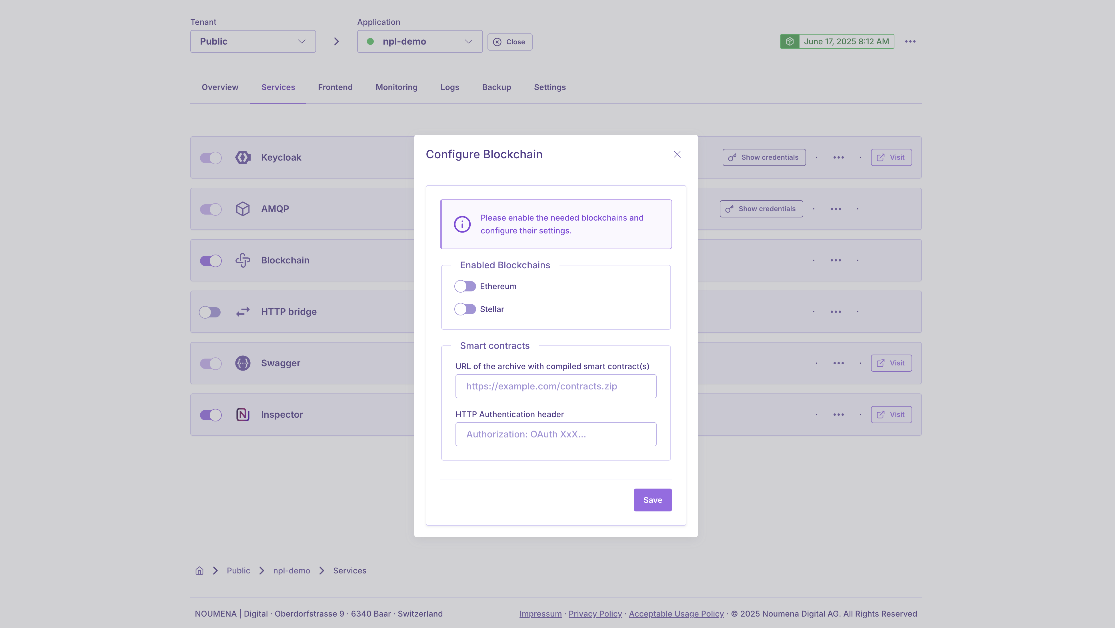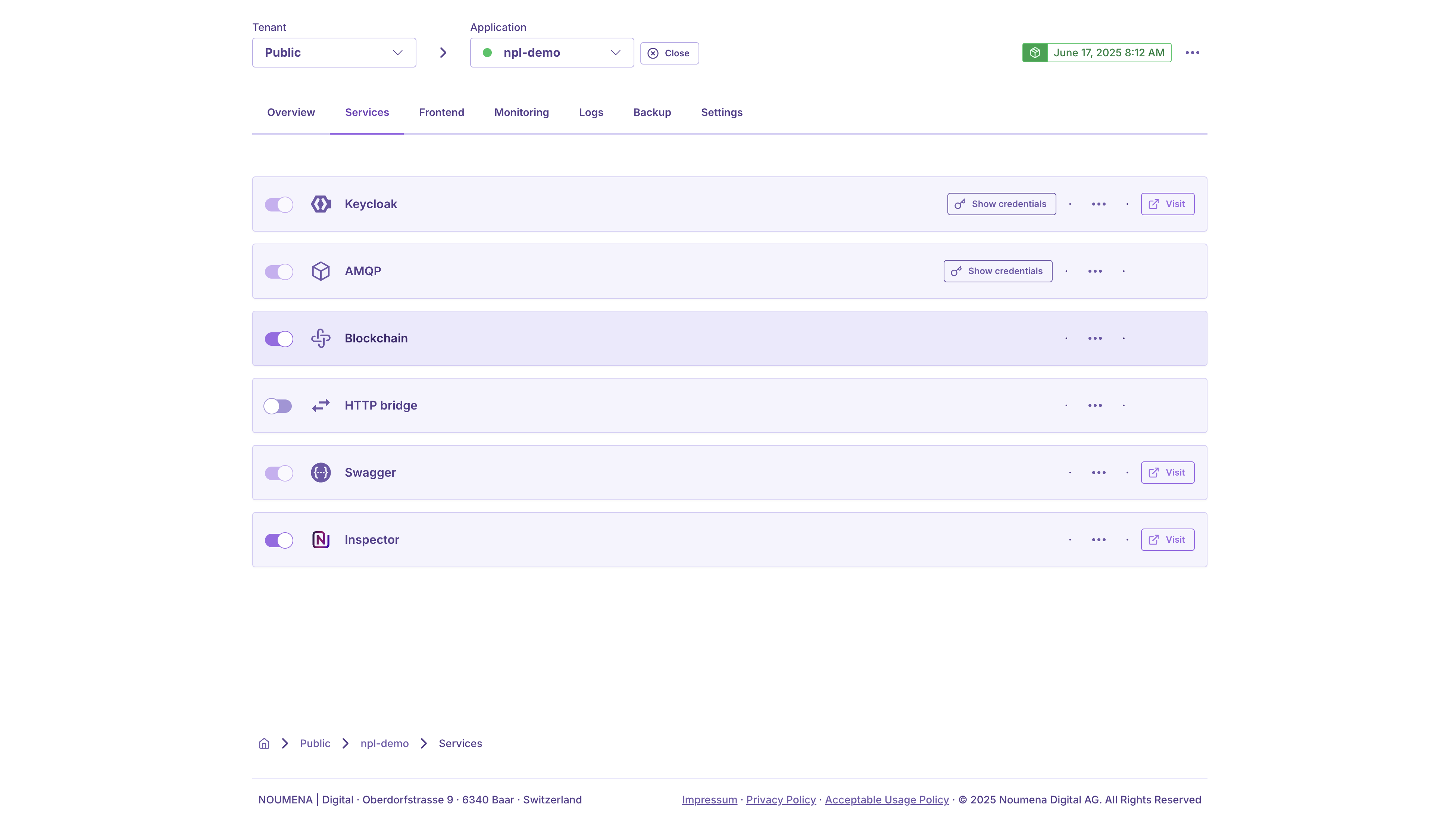 Blockchain Connector can be enabled in your Noumena Cloud application by navigating to the services section in the Noumena Cloud portal and toggling the Blockchain service on. This will allow you to use the Blockchain Connector for interacting with blockchain directly from your NPL applications.
