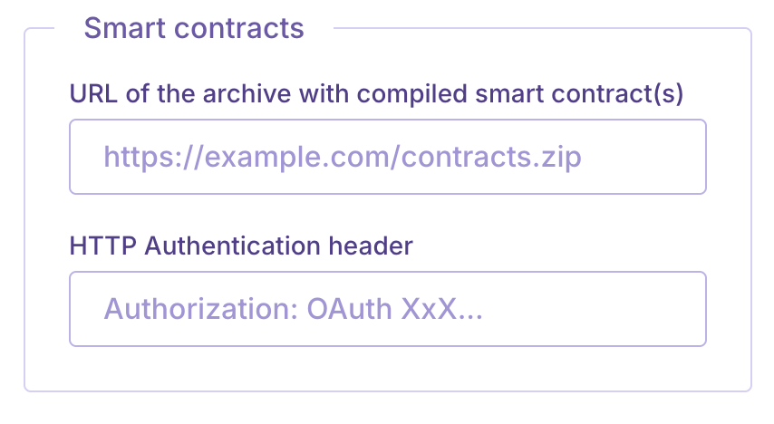 The archive with compiled smart contracts can be provided via URL. If the access to it is protected, you can specify an authentication header that will be used when fetching the smart contracts.