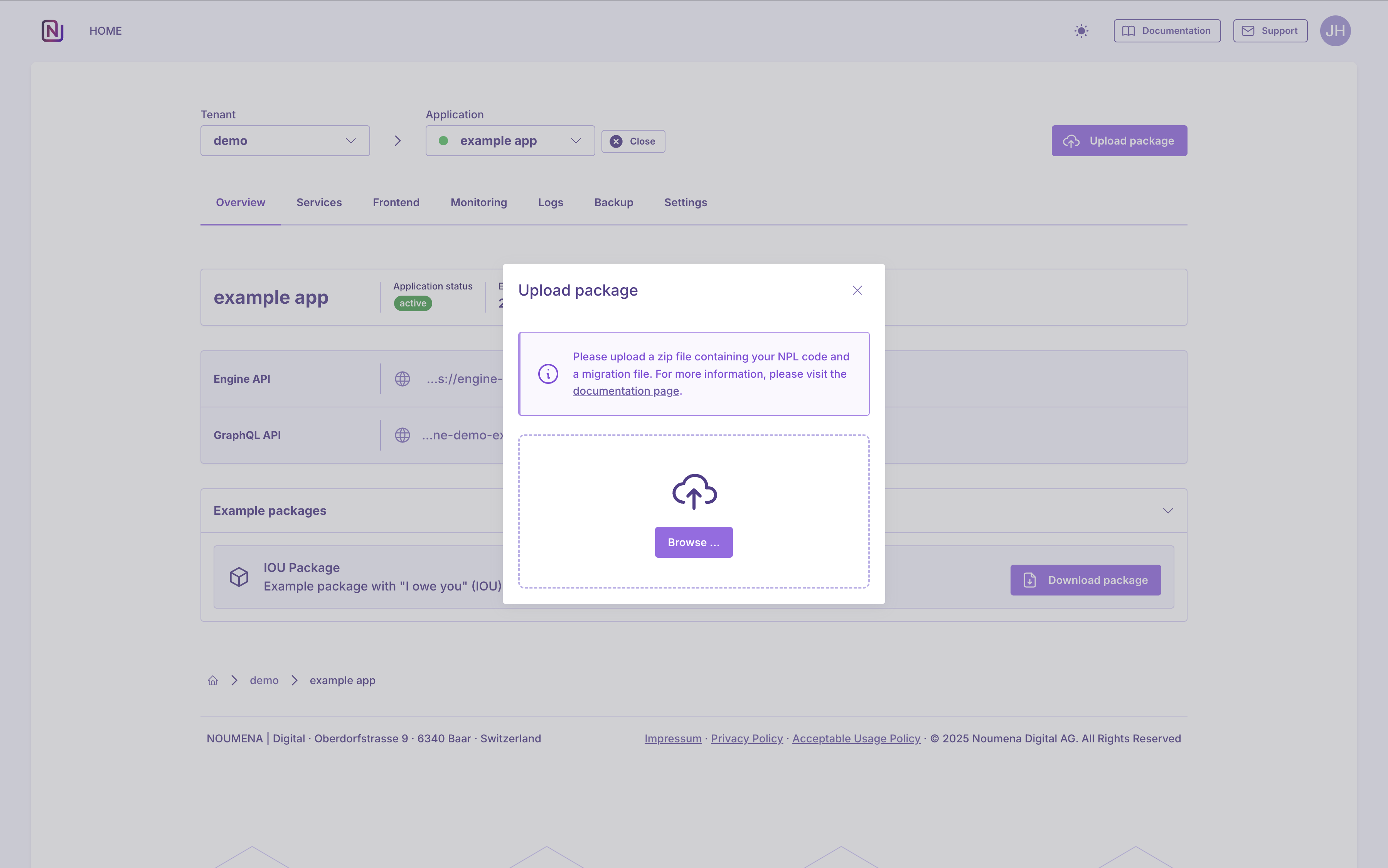 From there, you can proceed directly to upload using the NOUMENA Cloud Portal UI, the NPL CLI, or an IDE NPL-Dev plugin.