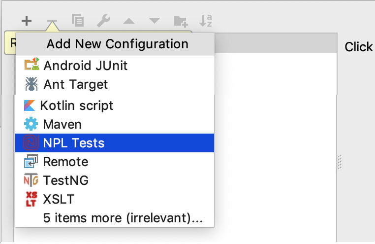 Click + in the upper left corner, and select NPL Tests. Change the name Unnamed to something meaningful, e.g.