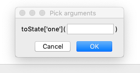When the action has some parameters, a simple window to enter them is shown. Note that you must match the signature of the function exactly, otherwise you will receive an error (no syntax highlighting or error marking is performed in this window yet). You can use arbitrary expressions here, including calling built-in or user-defined functions.